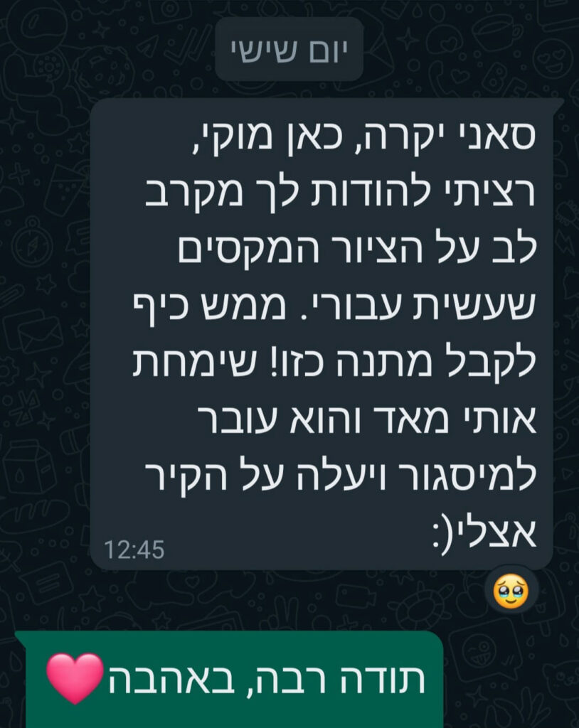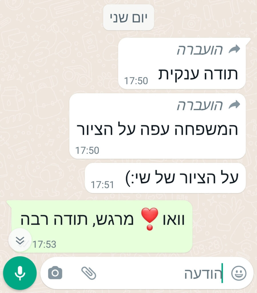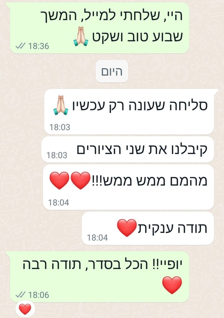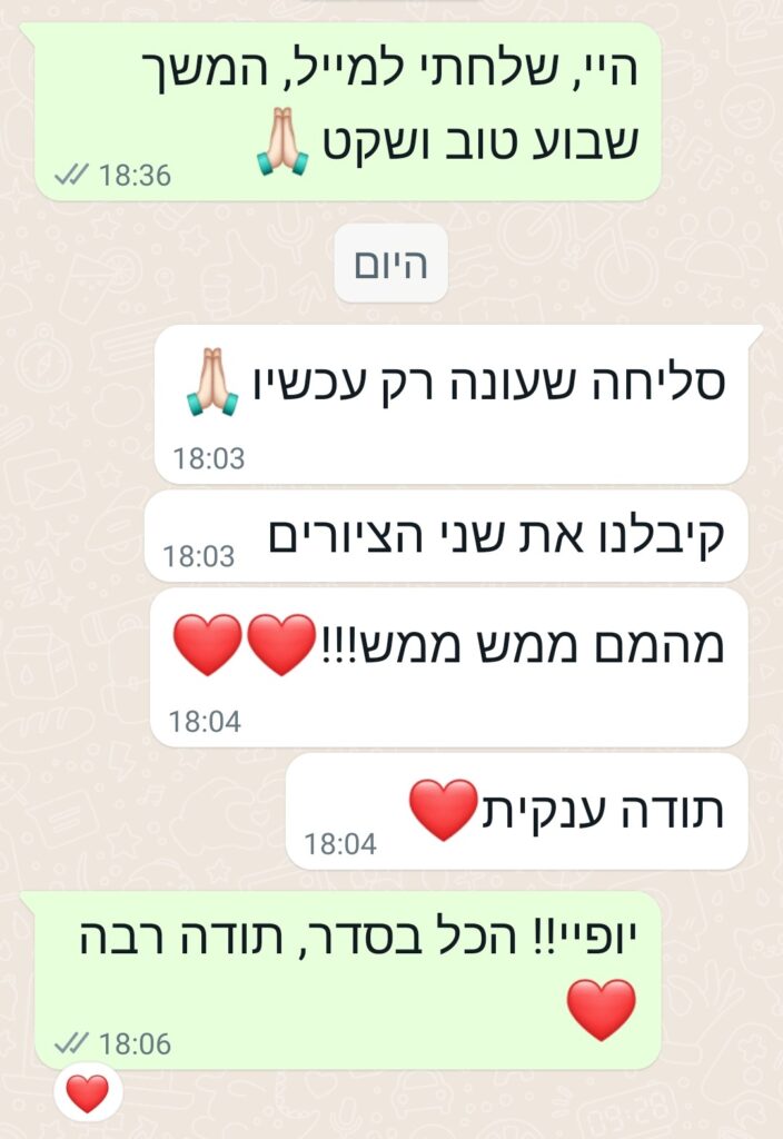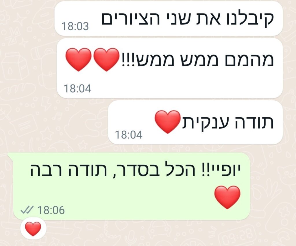 מתחילים בשיחה קצרה בוואטסאפ לתיאום ציפיות ורפרנס. בוחרים גודל וחומרי עבודה, מקבלים הצעת מחיר