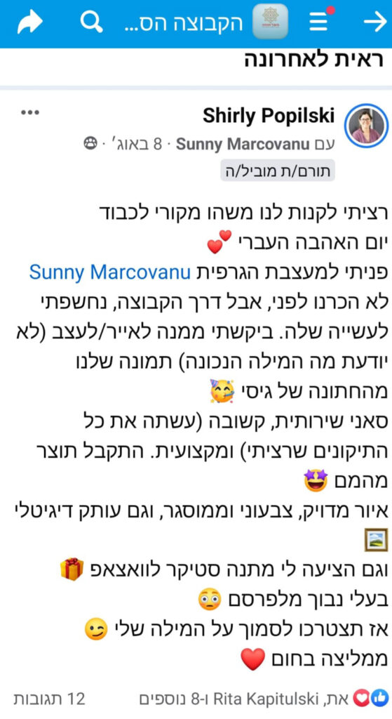 סאני מרקובאנו, מעצבת גרפית וציירת, בעלת סטודיו לציור בסגנונות שונים, מסורתי ודיגיטלי וסדנאות רישום בעיפרון, הסטודיו שלי מתמחה בציורים מותאמים אישית, ציורים בסגנון נקי ואלגנטי, בצבע, ליחידים, זוגות, משפחות, ציורי חתן וכלה וציורי דמויות מצוירות, הציורים מושקעים ומדויקים, מזכרת בתוך מסגרת שאיתכם לתמיד נשארת, מתנה יקרת ערך שמתאימה לכל אירוע חגיגי או סתם כי בא לשמח את ליבם של האהובים שלכם.